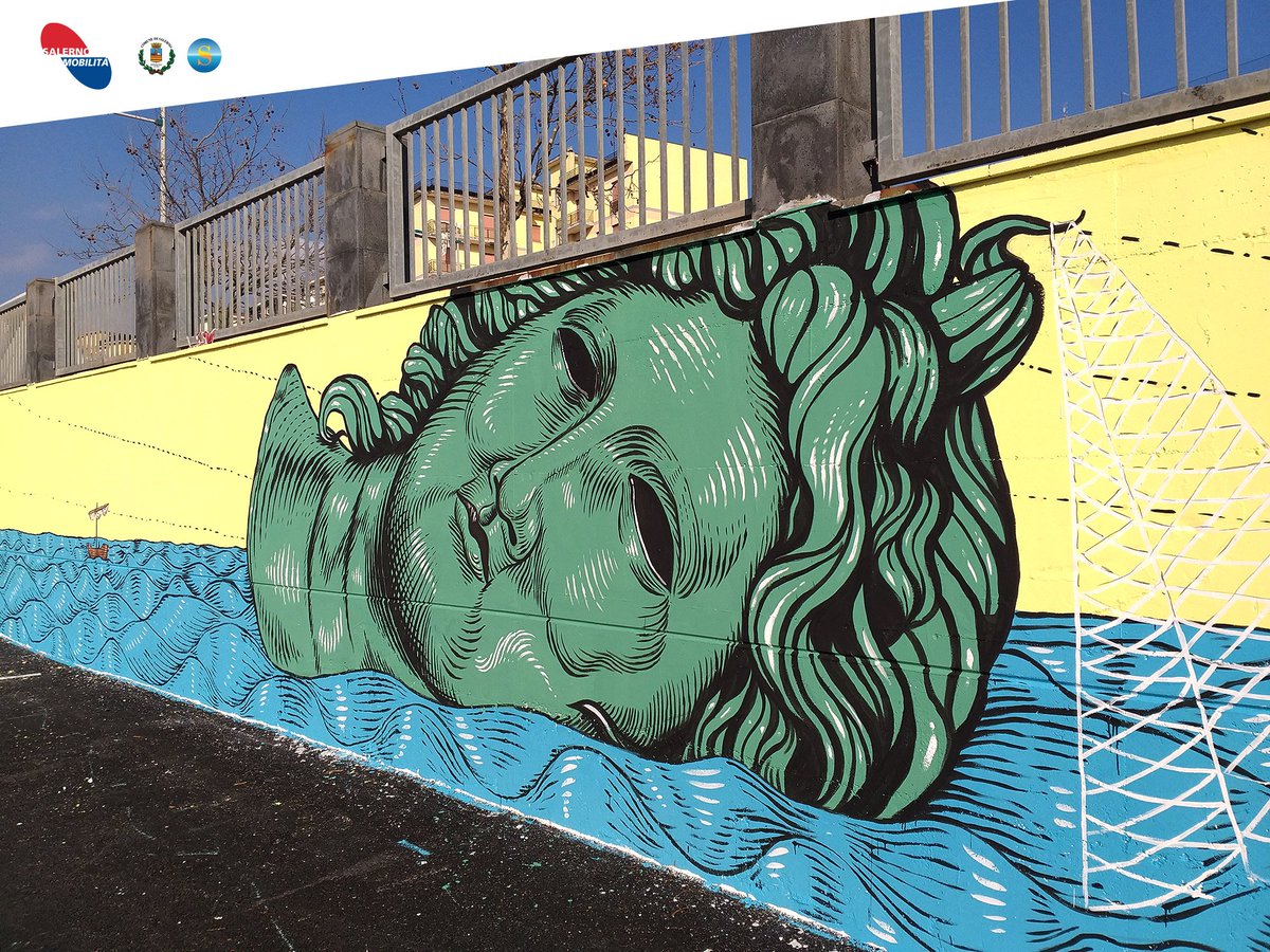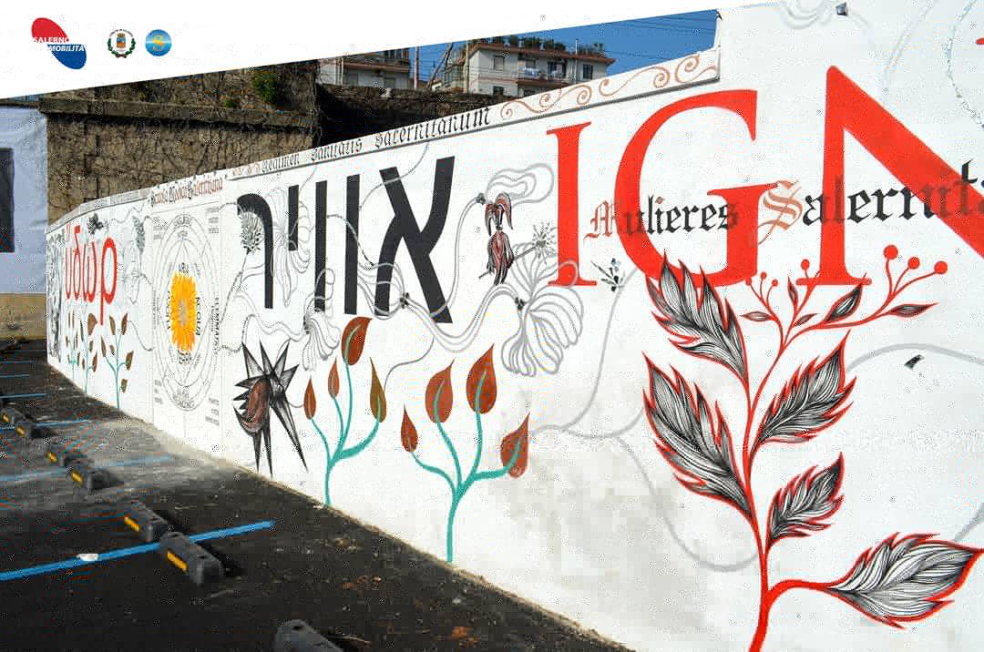METROCUBO, NUOVA VITA DEGLI SPAZI URBANI – Il murale di Trotula de Ruggiero a Salerno fa parte del progetto MetroCubo, promosso nel mese di febbraio da Salerno Mobilità e dalla Fondazione Alfonso Gatto, attiva ormai da anni nella riqualificazione di spazi urbani attraverso l’arte pubblica con l’iniziativa Muri d’autore. All’interno del Park Vinciprova sono stati realizzati murales che rappresentano l’identità della città di Salerno, attraverso la celebrazione del suo presente e il ricordo del suo passato. L’iniziativa ha visto come protagonisti oltre a Jorit anche All Anema crew, autore dell’opera Salernum; Andrea Casciu, che ha realizzato il murale La pesca miracolosa; Green Pino, al secolo Pino Roscigno, autore dell’ opera I quattro elementi.