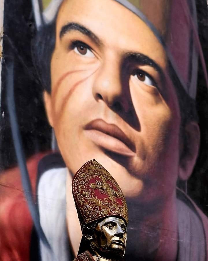 Volto fiero e disincantato, volto che guarda, ma che, esposto solo da un lato alla luce non si fa guardare, quello di Trotula De Ruggiero è un volto immaginato da Jorit per dare forma ad una storia salernitana che risale all’XI secolo d.C.. Quella di Trotula è la storia di una donna forte e coraggiosa, una pioniera della medicina che ha portato importanti novità nel campo della ostetricia. Prima donna medico in Europa operò nella Scuola Medica Salernitana, segnando la nascita dell’ostetricia e della ginecologia in Italia. Scrisse due trattati di medicina che si tramandano ancora nei nostri giorni.