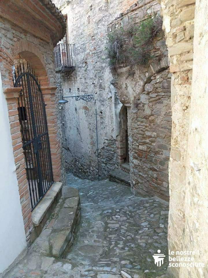 STORIA – Dopo il declino di Pandosia, l’antica colonia magno-greca, avevano qui trovato sicuro rifugio i Goti prima (intorno al V secolo circa), poi i Saraceni (IX – X secolo) e quindi i Bizantini. Dunque, dalla perduta origine forse gotica e dai resti strutturali di civiltà arabo-musulmana, ormai mimetizzati da insediamenti e stratificazioni successivi, lo storico rione conservava i resti di un torrione dell’ampio fortilizio, ormai “diruto” alla fine del ‘700, un tempo inespugnabile come pochissimi nell’intera regione.
