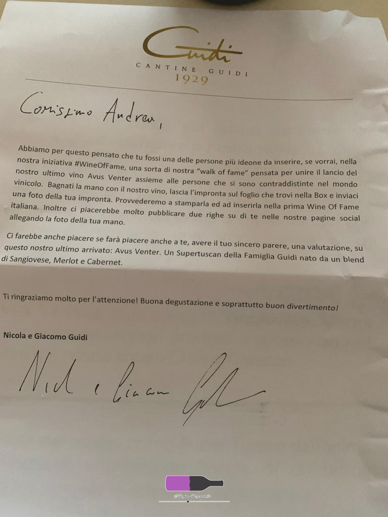 Oggi sarà protagonista una delle aziende più importanti della Toscana, stiamo parlando di Cantine Guidi e del suo Avus Venter. L’azienda, inoltre ha onorato Andrea Moscariello con l’inserimento nella “Wine of Fame” delle Cantine Guidi, una sorta di walk of fame riservata a poche importanti figure enogastronomiche.