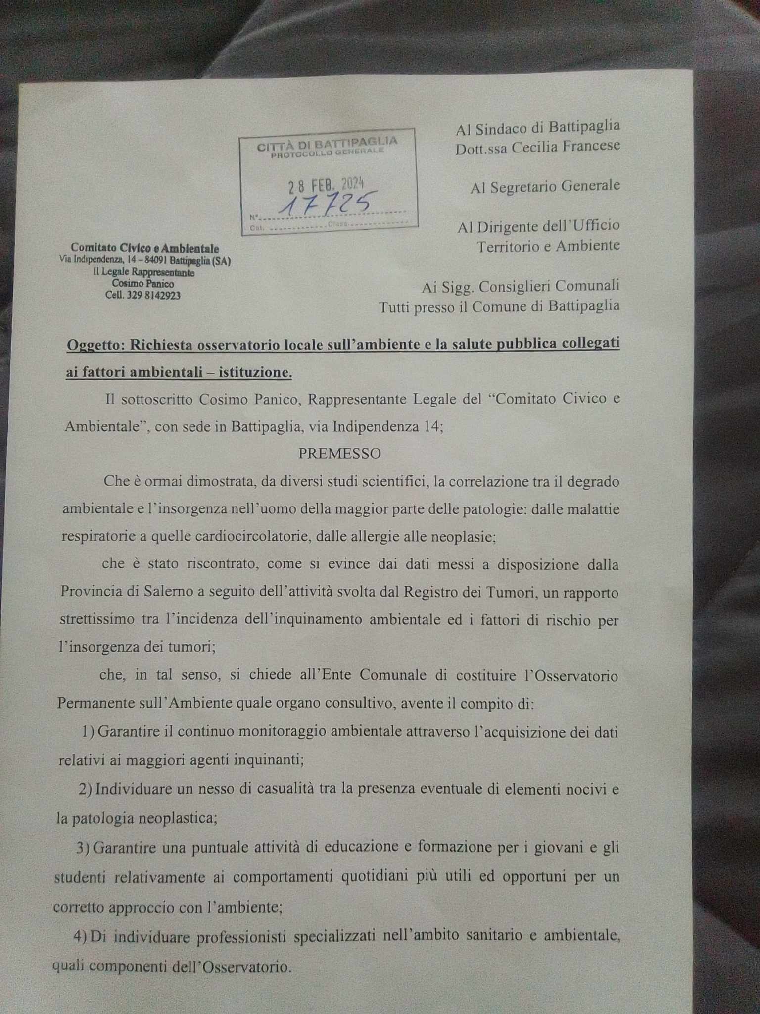 Questa mattina il “Comitato Civico e Ambientale” di Cosimo Panico, ha protocollato al comune di Battipaglia una richiesta ufficiale atta a richiedere l’istituzione di un osservatorio locale sull’ambiente e la salute pubblica.