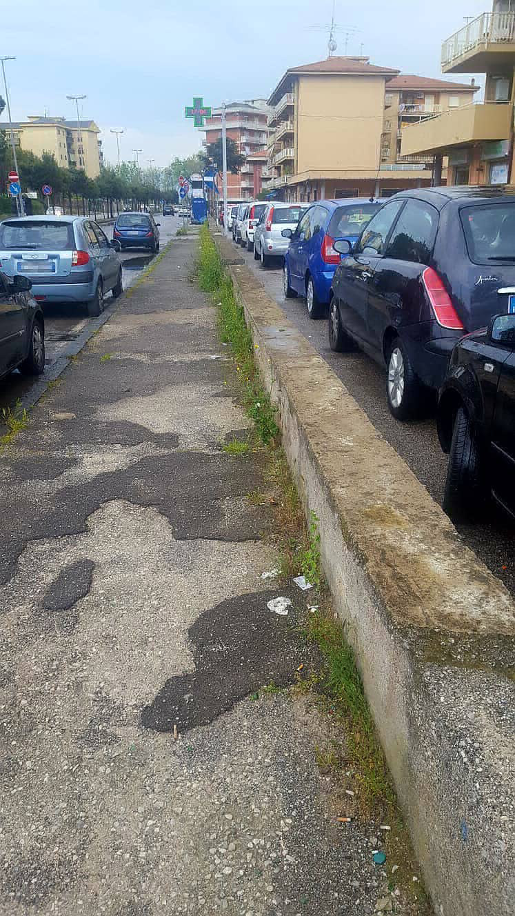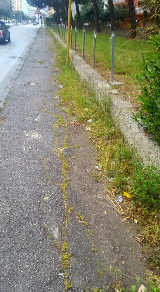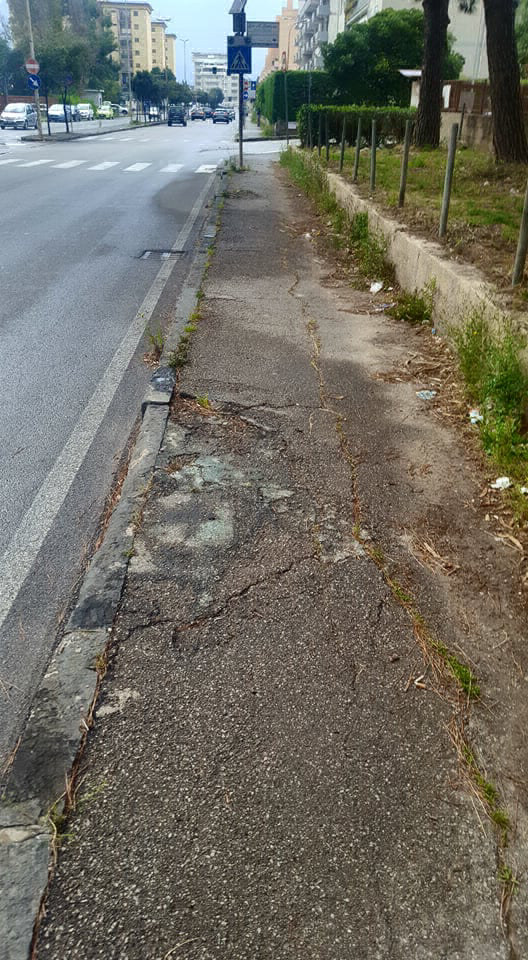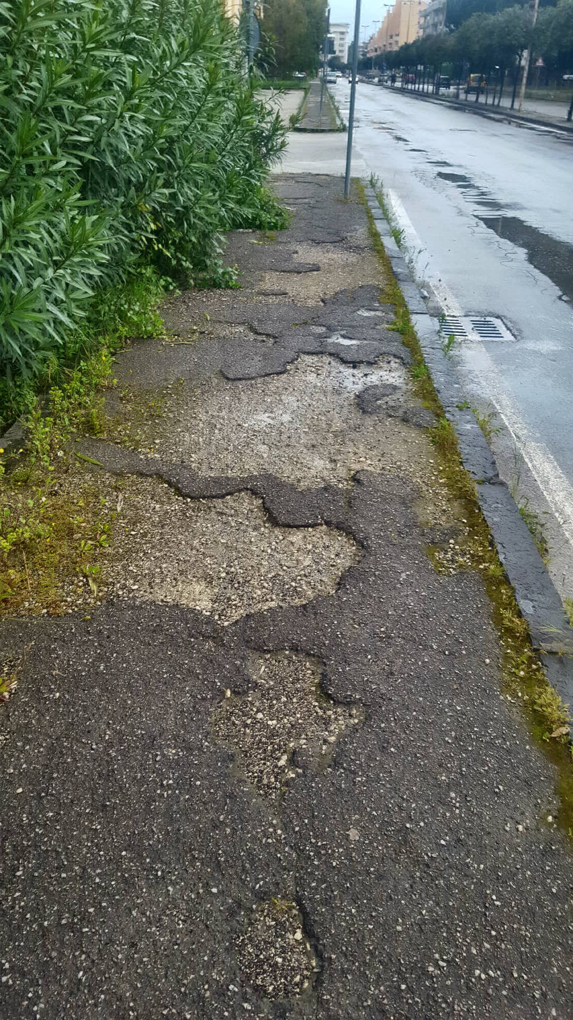 Lungo il Viale della Libertà bisogna camminare con gli occhi che guardano a terra: tra mattonelle “ballerine”, cemento e pietre consumati e erbacce folte, i marciapiedi esistono ancora solo grazie all’incuria più totale.