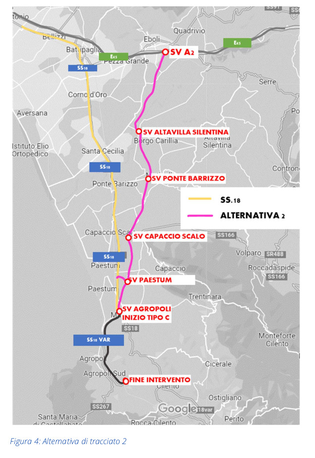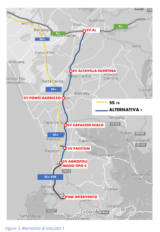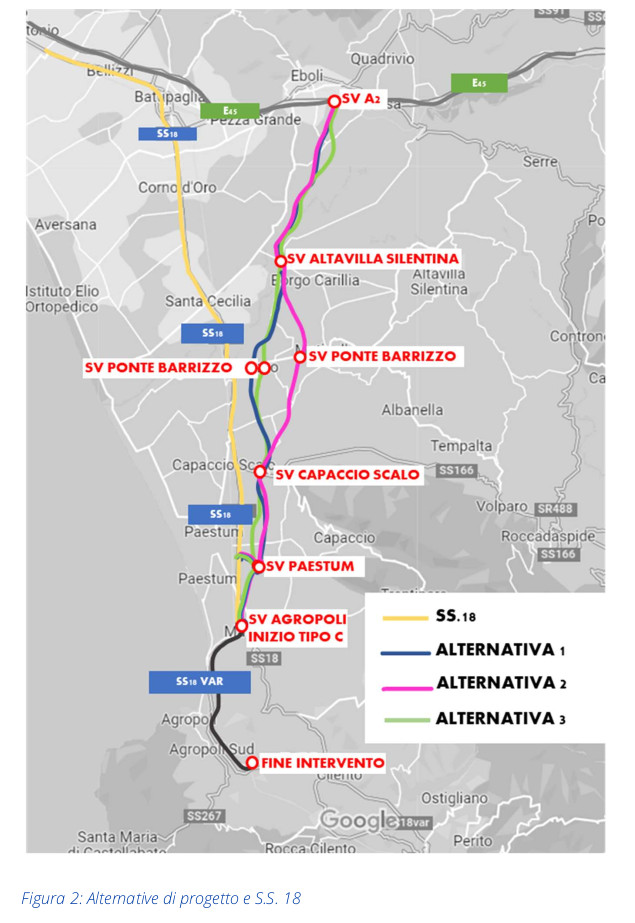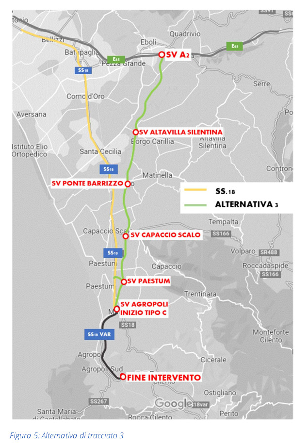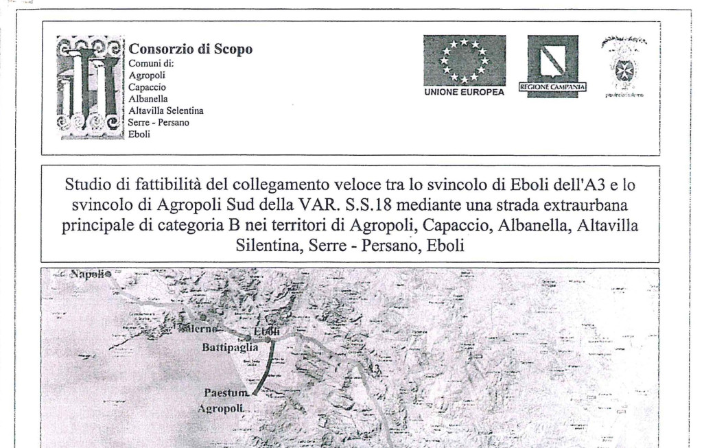 Il progetto dell’opera nasce da una Convenzione stipulata tra Anas e Regione Campania in data 24.10.2017. In tale occasione la Regione Campania ha fornito ad Anas un documento redatto a giugno 2015 da un Consorzio di Scopo tra i Comuni di Agropoli, Capaccio, Albanella, Altavilla Silentina, Serre-Persano ed Eboli. Tale studio è diventato la base sulla quale l’Anas ha costruito il suo studio di fattibilità e sostanzialmente coincide con l’alternativa 3 presente nei documenti (delle tre alternative parliamo in dettaglio più avanti).