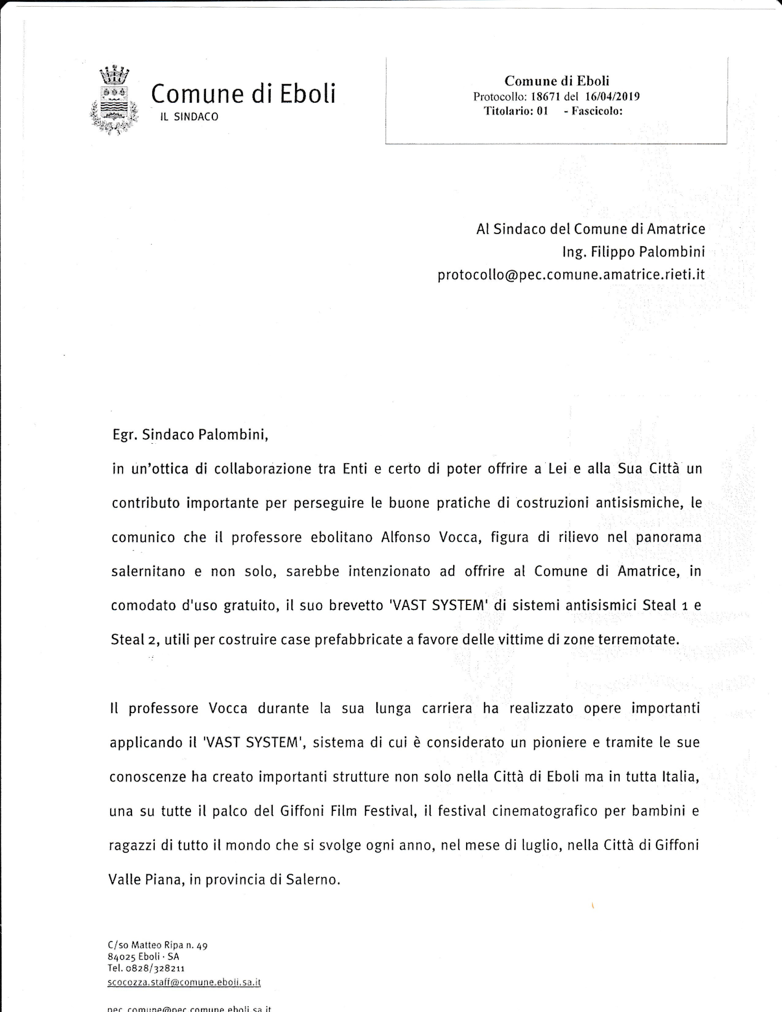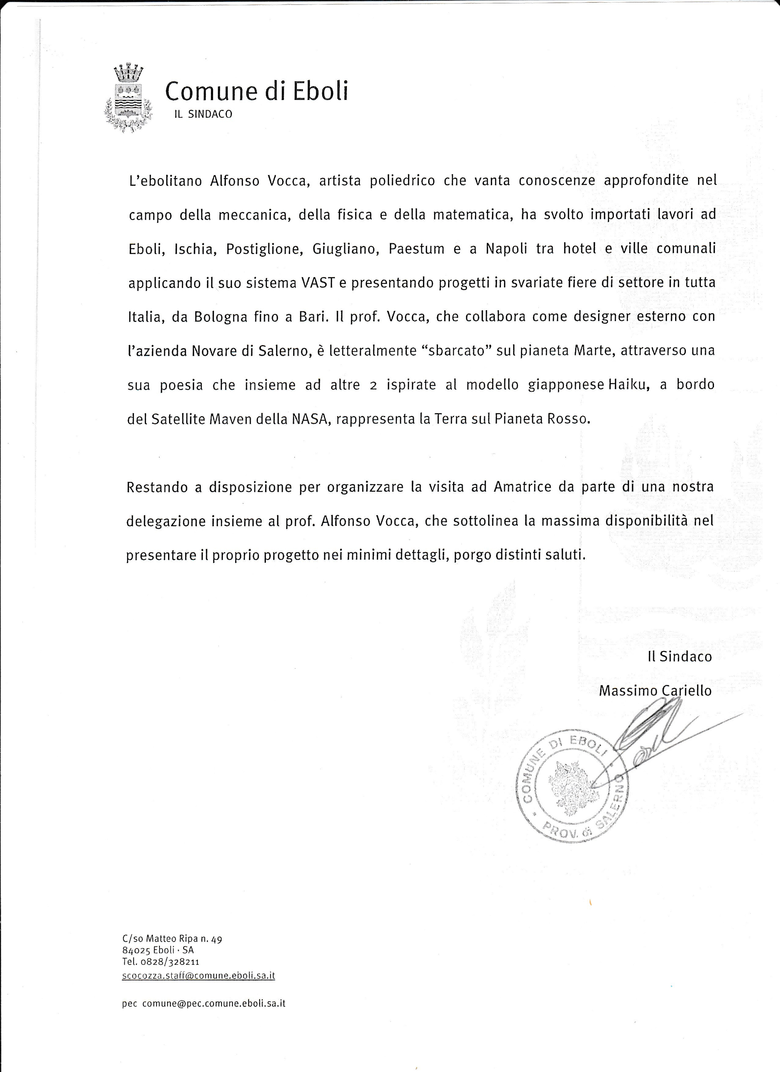 Il Sindaco della città di Eboli, Massimo Cariello, ha accolto di buon grado la richiesta del professore e ha scritto qualche giorno fa una lettera ufficiale in cui propone al sindaco Palombini di prendere in considerazione l’idea del professore.