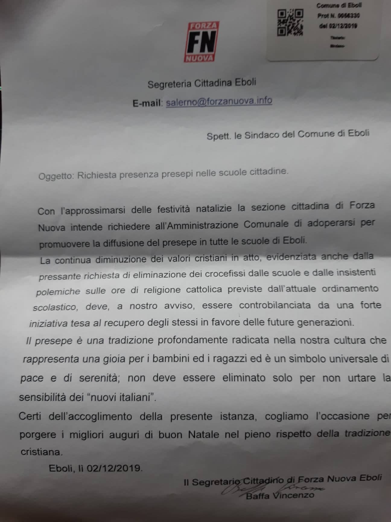 Con l’approssimarsi delle festività natalizie la sezione cittadina di Forza Nuova Eboli-Campagna, intende richiedere all’Amministrazione Comunale di adoperarsi per promuovere la diffusione del presepe in tutte le scuole di Eboli.