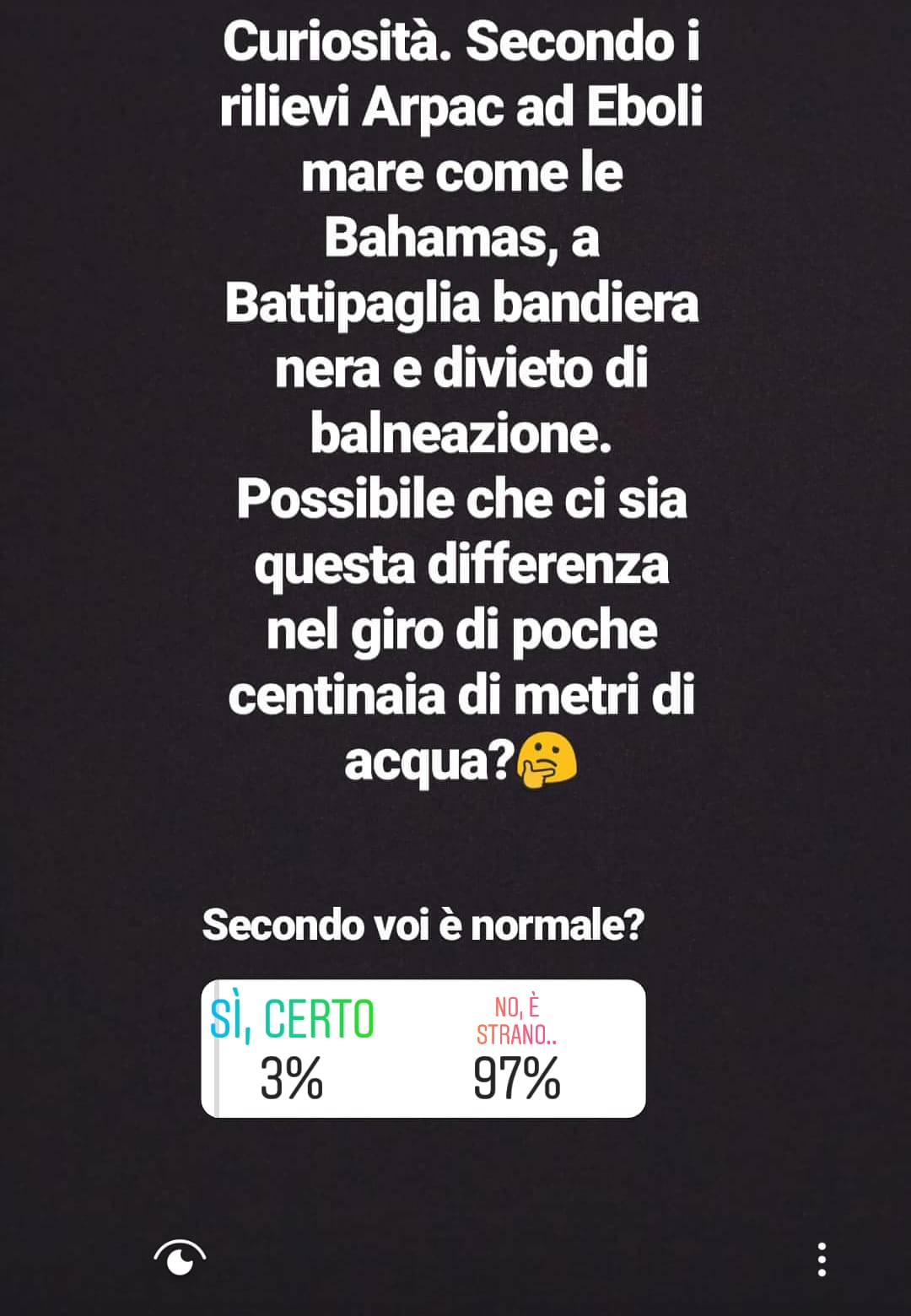 SONDAGGI – Infatti, dai sondaggi che abbiamo lanciato negli scorsi giorni, oltre l’80% di cittadini ebolitani e battipagliesi non hanno molto chiari i metodi con cui vengono effettuati i campionamenti e si chiedono come sia possibile che lo stesso specchio d’acqua abbia in poche centinaia di metri di distanza una sproporzione così ampia.