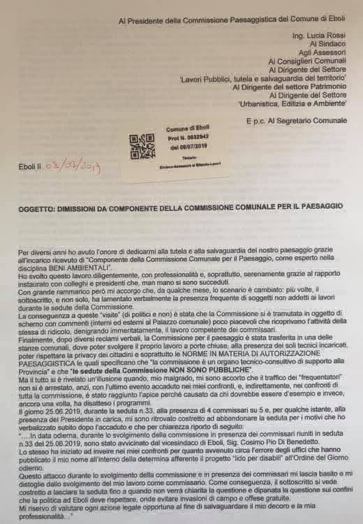 “Il giorno 25.06.2019, sono stato aggredito verbalmente dal Sig. Cosimo Pio Di Benedetto durante la seduta n.33 della Commissione Comunale per il Paesaggio, alla presenza di tutti i commissari (eccetto un assente) e, per alcuni attimi, del Presidente in carica.