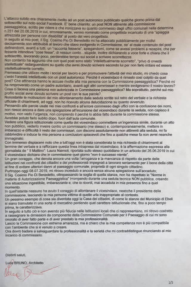 Bruno è, o forse è meglio dire ‘era’, uno dei componenti della Commissione Comunale per il Paesaggio di Eboli e in data odierna, a seguito di un polverone alzatosi dopo il sopracitato caso della nomina a progettista del nuovo lido per disabili, ha deciso di rassegnare le proprie dimissioni.