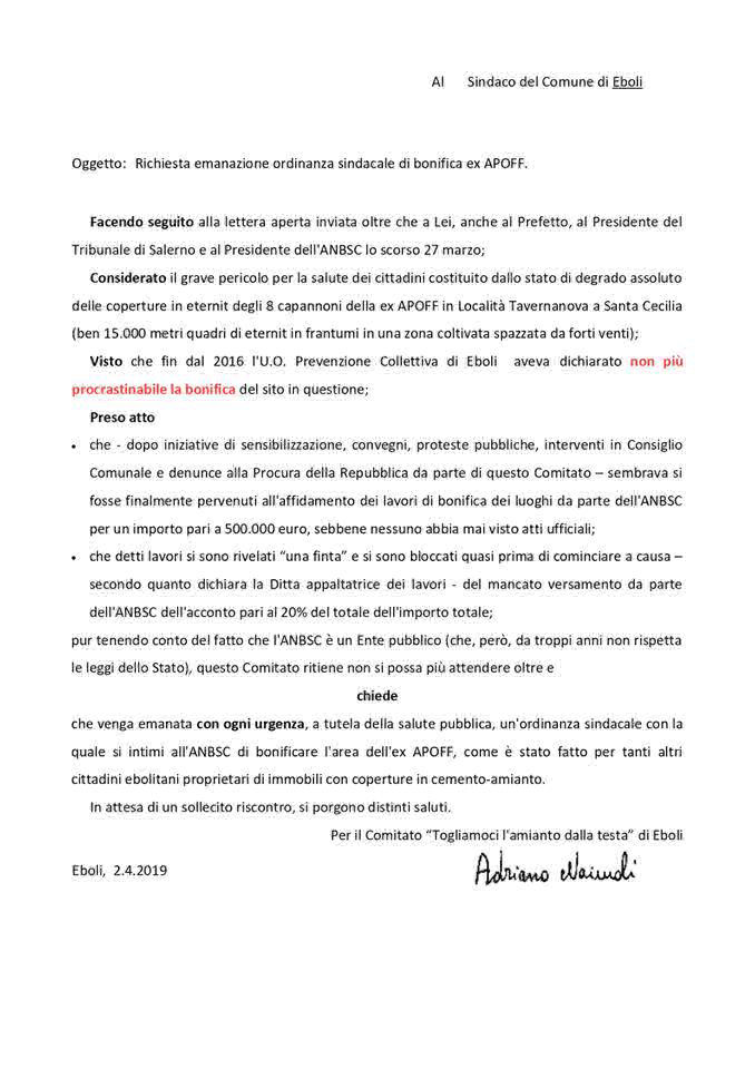 Dopo il recente stop ai lavori di bonfica della struttura ex Apof di Eboli, di cui vi abbiamo parlato negli scorsi giorni, il comitato “Togliamoci l’amianto dalla testa” aveva chiesto, tramite una lettera inviata lo scorso 7 marzo al Sindaco di Eboli Massimo Cariello, di prendere una posizione in merito a questa situazione alquanto surreale.