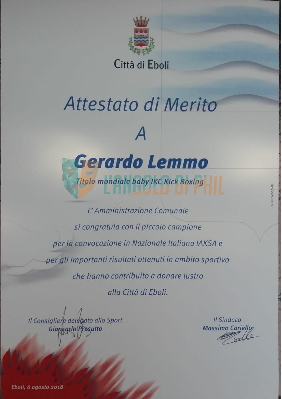 Il piccolo campione del mondo juniores di kick-boxing, è stato accolto dall’amministrazione comunale della sua città natale per celebrare un anno ricco di successi e di vittorie, culminate con la convocazione nella Nazionale IAKSA. Alla presenza del Sindaco di Eboli, Massimo Cariello e del consigliere comunale con delega allo sport, Giancarlo Presutto, si è svolta la cerimonia di premiazione in cui il piccolo Lemmo ha ricevuto un attestato di merito all’interno dell’aula consiliare di Palazzo Città.