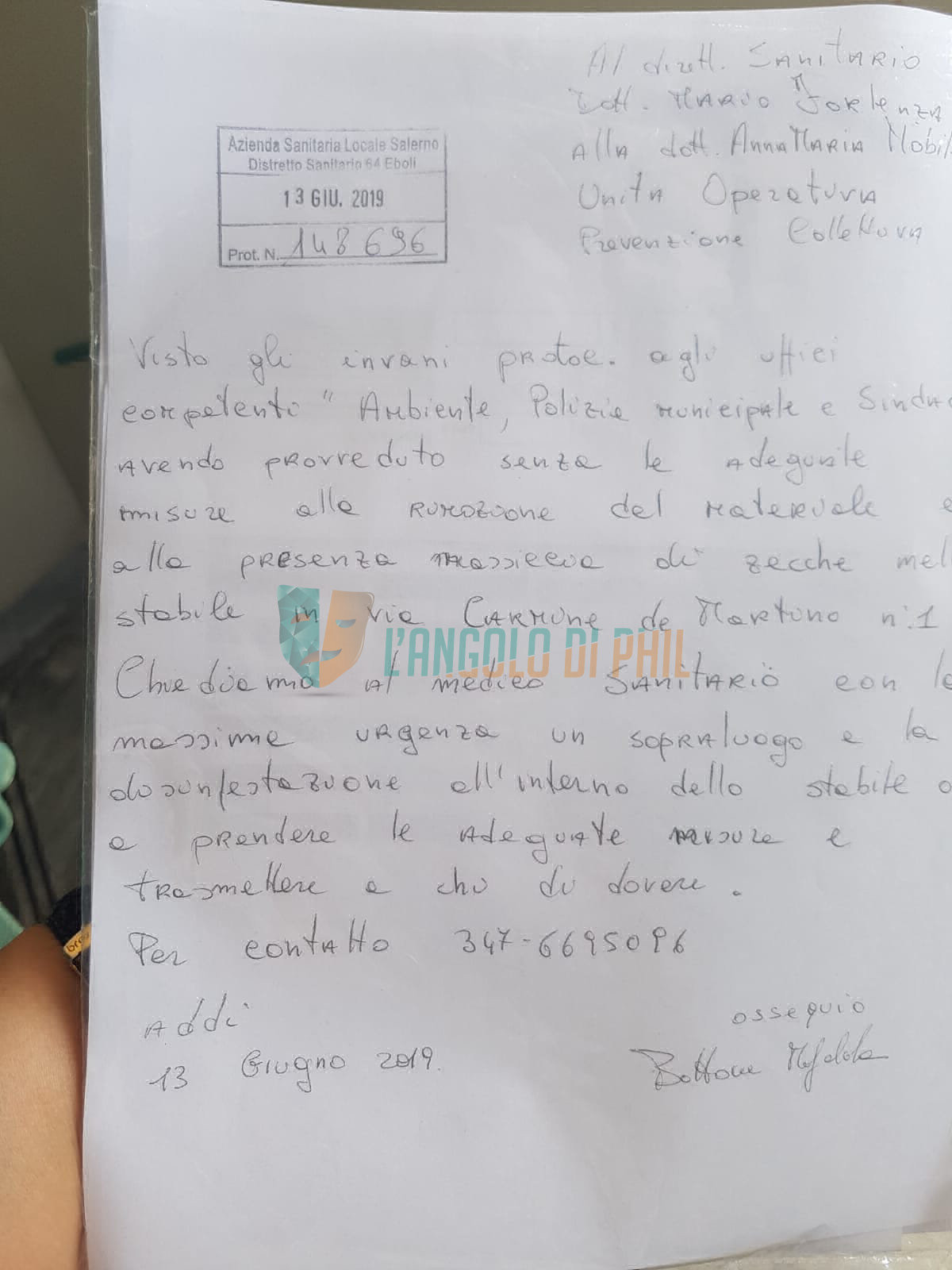 Con un esposto protocollato all’ASL di Eboli, i residenti dello stabile in via Carmine de Martino n°1, chiedono l’intervento del medico sanitario per valutare lo stato igienico di una situazione che sembra stia sfuggendo di mano.