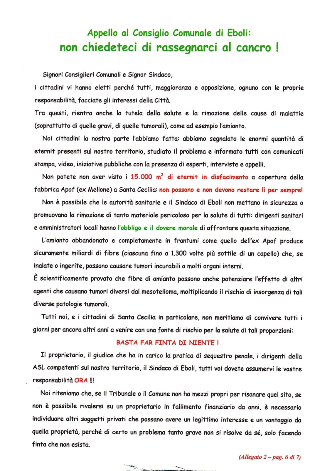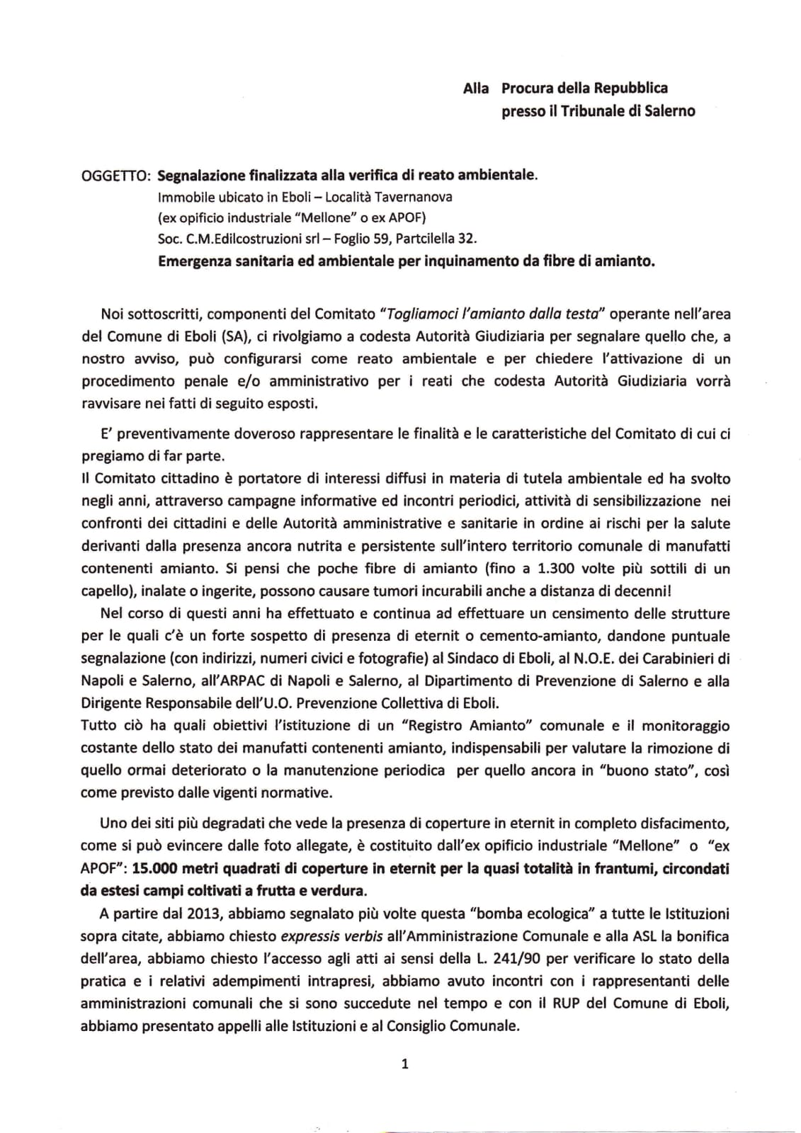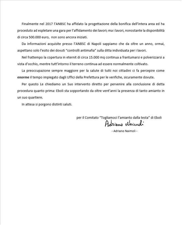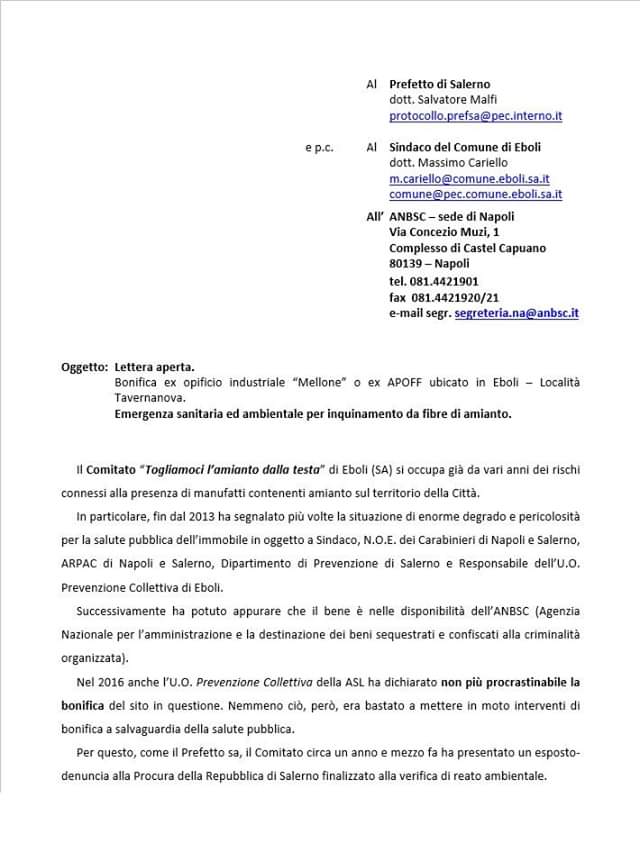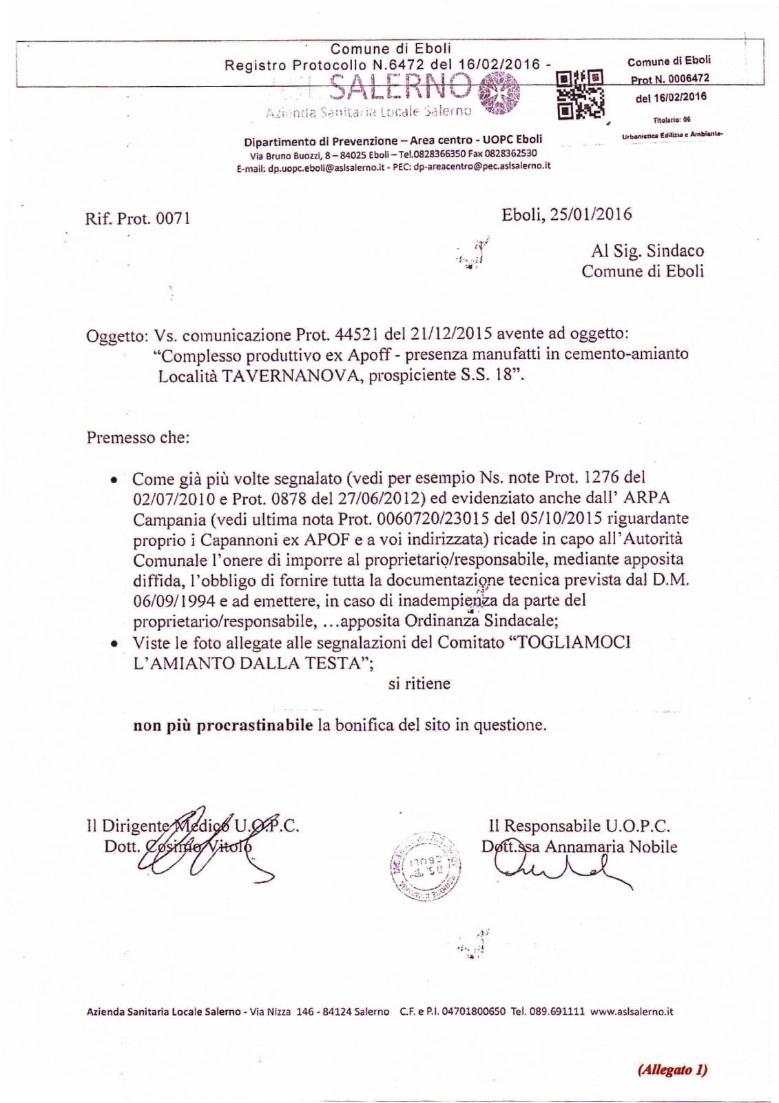 Dal giorno della chiusura e dello sgombero dello stabilimento i complimenti si sono sprecati e tanti progetti sono stati varati, tra cui quello lodevole da parte dell’Ente di poter far diventare l’area un ‘Istituto di fine pena’, ovviamente solo a bonifica effettuata. Ma, di questa bonifica non se ne parla per ora e c’è chi, come i membri del Comitato ‘Togliamoci l’Amianto dalla testa’, stanno monitorando la situazione da anni e negli scorsi giorni, stanchi di sentirsi ripetere che ‘i lavori inizieranno a giorni’, hanno avuto un incontro con il sindaco di Eboli, Massimo Cariello, presentando un nuovo dossier sulla pericolosità dell’ex Apoff per la salute pubblica, dopo i tanti già inviati sia al Prefetto sia alla Procura della Repubblica: