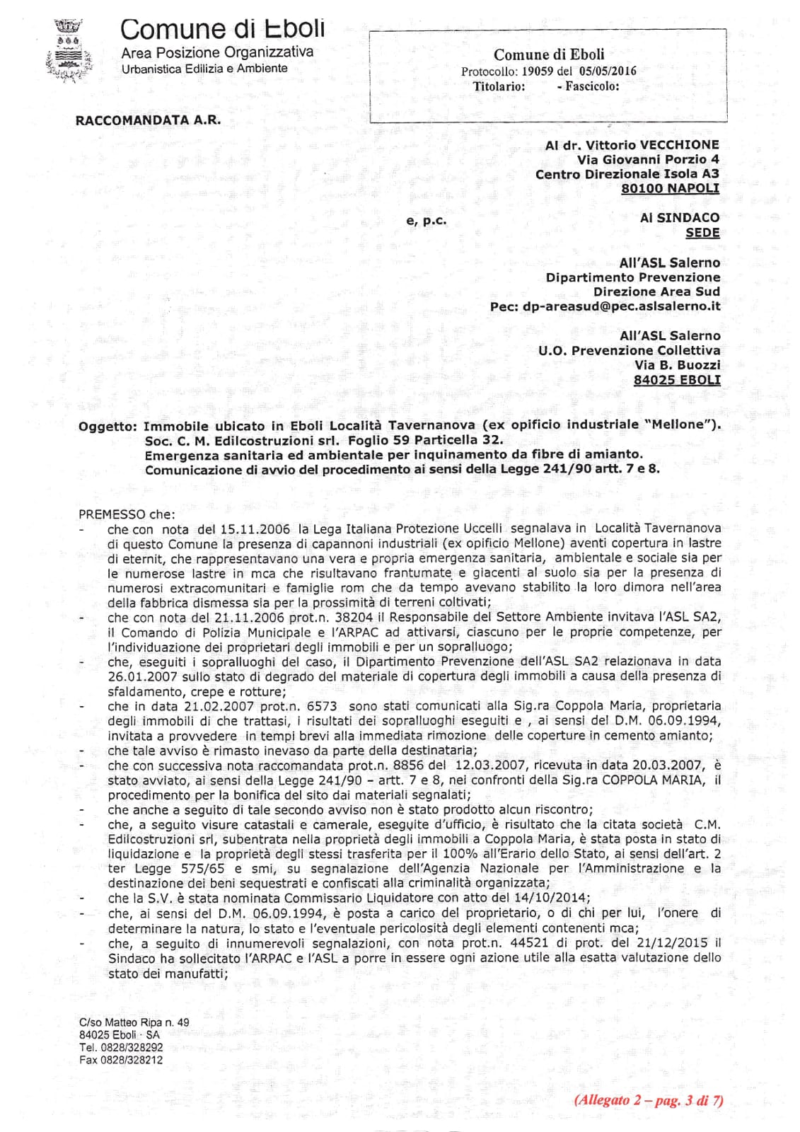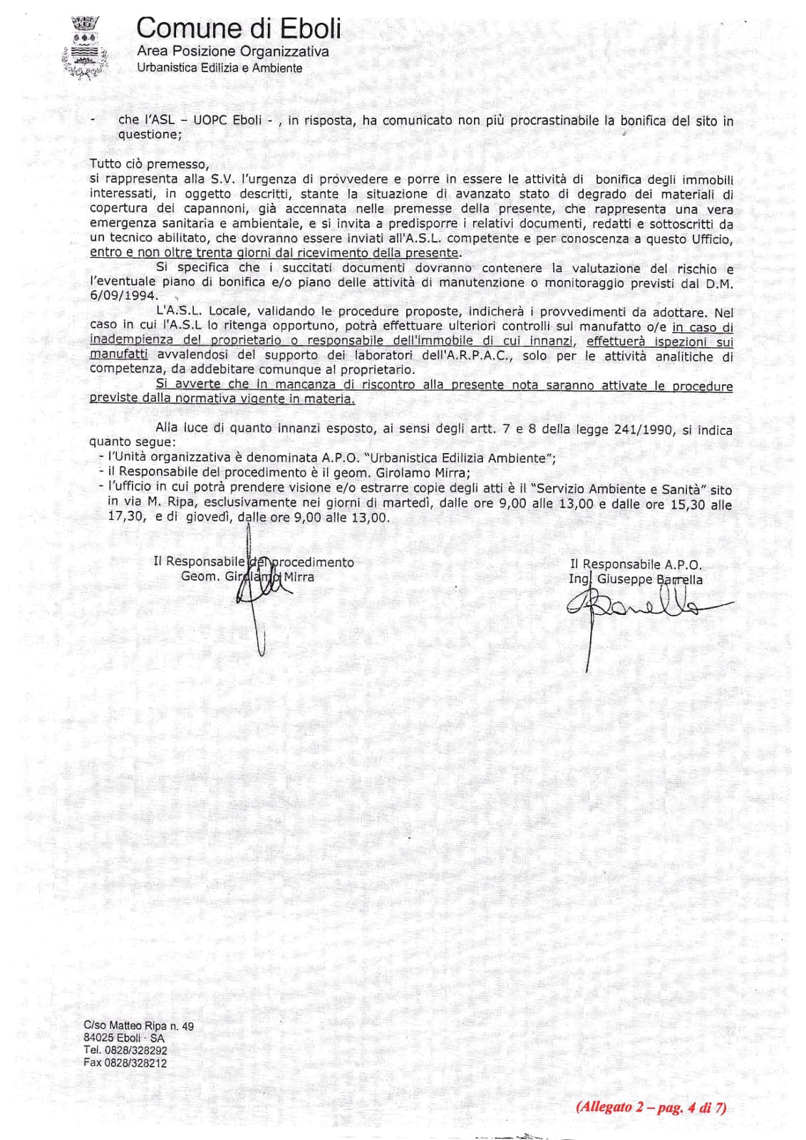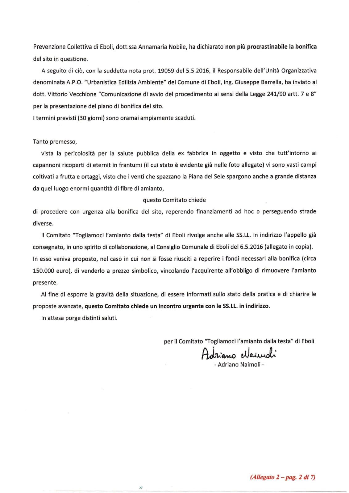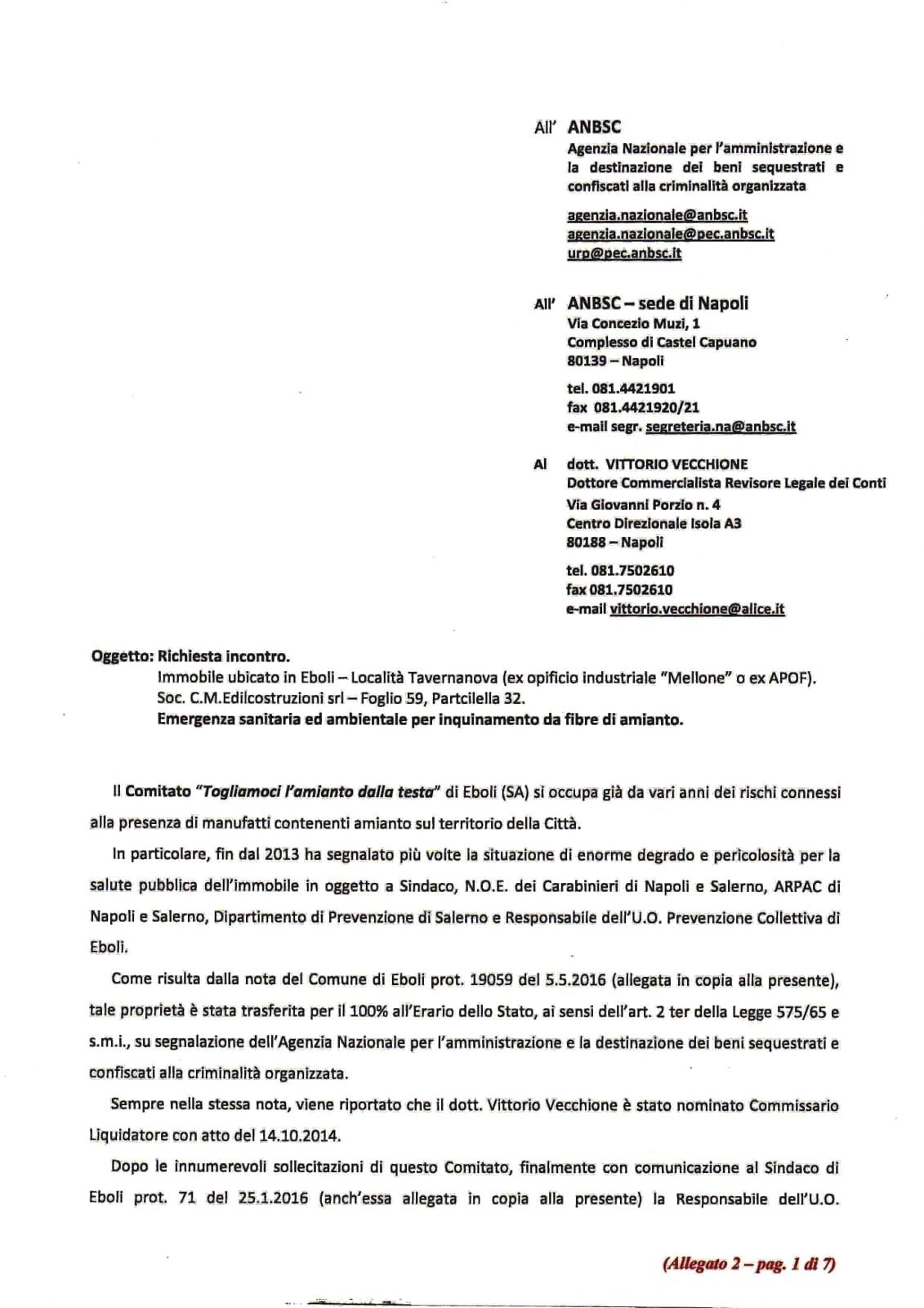 Dal giorno della chiusura e dello sgombero dello stabilimento i complimenti si sono sprecati e tanti progetti sono stati varati, tra cui quello lodevole da parte dell’Ente di poter far diventare l’area un ‘Istituto di fine pena’, ovviamente solo a bonifica effettuata. Ma, di questa bonifica non se ne parla per ora e c’è chi, come i membri del Comitato ‘Togliamoci l’Amianto dalla testa’, stanno monitorando la situazione da anni e negli scorsi giorni, stanchi di sentirsi ripetere che ‘i lavori inizieranno a giorni’, hanno avuto un incontro con il sindaco di Eboli, Massimo Cariello, presentando un nuovo dossier sulla pericolosità dell’ex Apoff per la salute pubblica, dopo i tanti già inviati sia al Prefetto sia alla Procura della Repubblica: