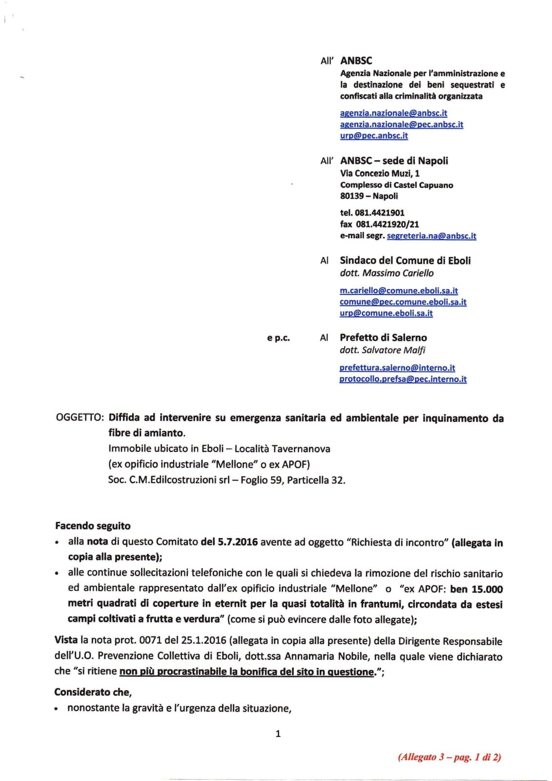 “Abbiamo incontrato il Sindaco e ci ha spiegato che purtroppo è l’Agenzia Nazionale per i Beni Confiscati alla criminalità organizzata a dover dare l’ok ed avviare le manovre per la bonifica dell’area – spiega Anna Grimaldi, presidente del Comitato – si è messo a nostra completa disposizione contattando anche la Regione per avere delucidazioni. L’Agenzia, invece, ci ha comunicato di nuovo che nei prossimi giorni ci saranno importanti novità, stavolta sarà vero?”.