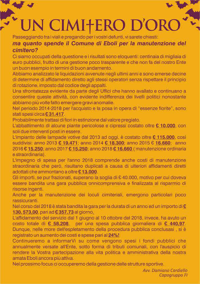 “Il Cimitero D’Oro”, è questo il nome dell’ questa l’iniziativa portata avanti dal consigliere di opposizione e capogruppo di Forza Italia, Damiano Cardiello, che pone l’attenzione sulle cifre esorbitanti spese dall’Ente per la manutenzione del cimitero.
