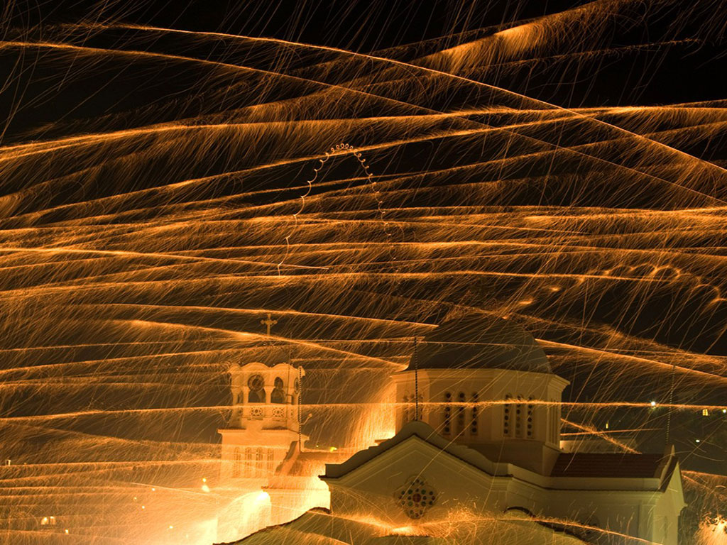 Durante la celebrazione della messa, la notte prima della domenica di Pasqua (quella ortodossa), è consuetudine in Grecia lanciare fuochi d’artificio, ma niente è tanto spettacolare quanto l’evento che si svolge a Vrontados, sull’isola di Chio.
