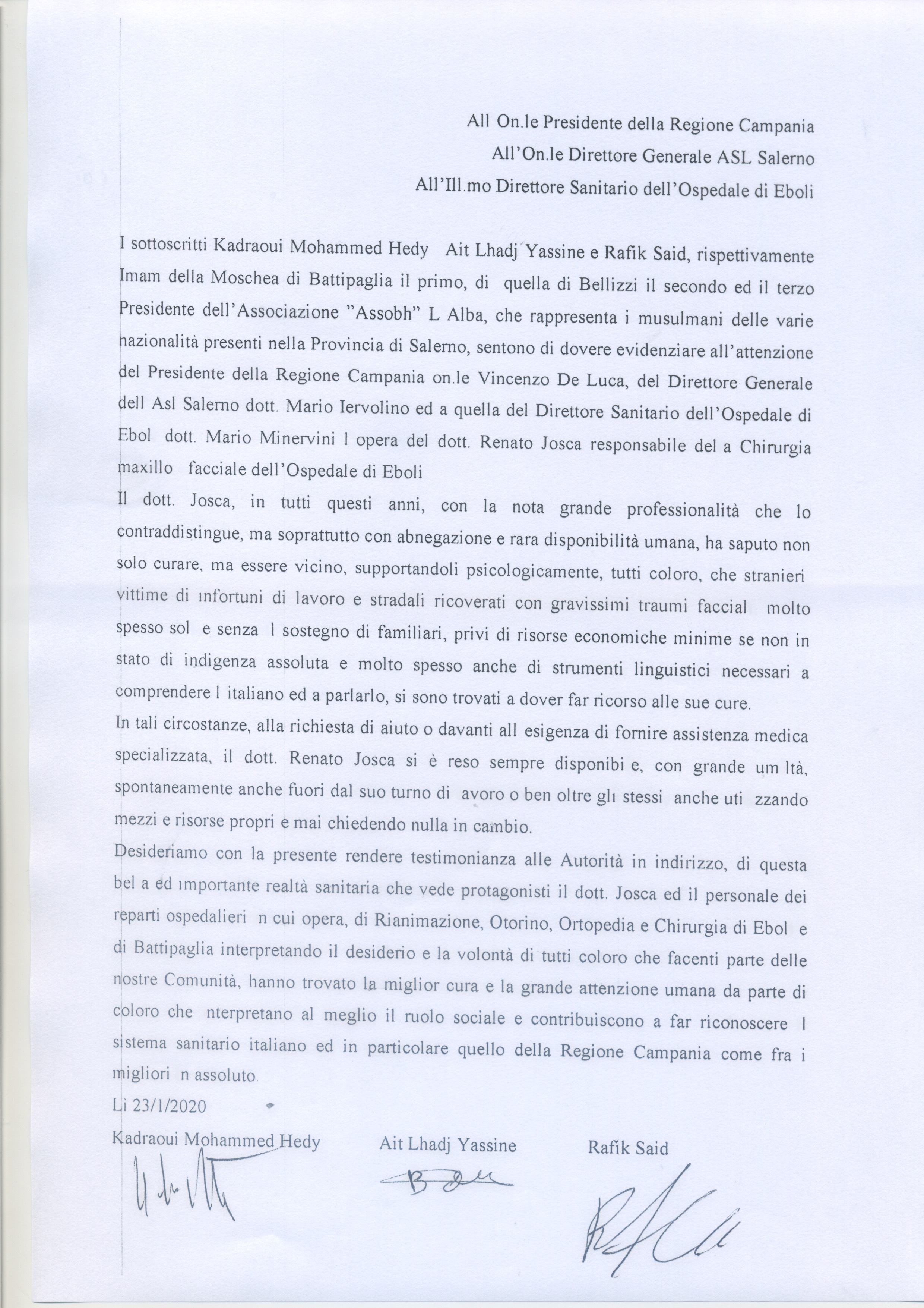 Infatti, Kadraoui Mohammed Hedy, Ait Lhadj Yassine e Rafik Said, rispettivamente Imam della moschea di Battipaglia il primo, di Bellizzi il secondo e il terzo Presidente dell’associazione “Assobh” – L’Alba (che rappresenta i musulmani di varie nazionalità della Provincia di Salerno) hanno inviato al presidente della Regione Campania Vincenzo De Luca, al direttore generale ASL Mario Iervolino e al direttore dell’ospedale di Eboli, Mario Minervini, un vero e proprio messaggio di elogio e ringraziamento al dott. Josca a nome di tutta la comunità musulmana.