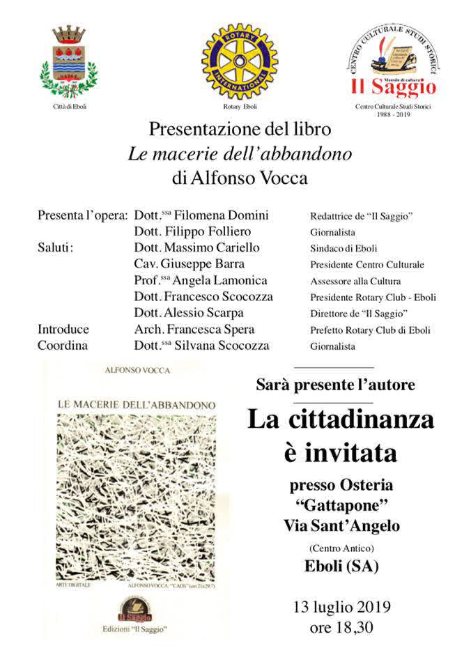 Oggi pomeriggio, a partire dalle ore 18.30 presso l’Osteria ‘Gattapone’ in via Sant’Angelo ad Eboli, sarà presentato il nuovo libro del professor Alfonso Vocca, dal titolo “Le macerie dell’abbandono”.