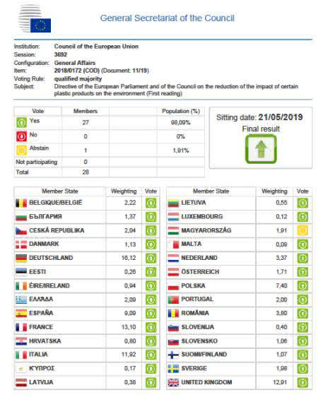 La direttiva vieta dal 2021 oggetti in plastica monouso come piatti, posate e cannucce. Anche le aste per palloncini e i bastoncini cotonati in plastica dovranno essere banditi. Gli Stati membri si sono inoltre impegnati a raggiungere la raccolta delle bottiglie di plastica del 90% entro il 2029 e le bottiglie di plastica dovranno avere un contenuto riciclato di almeno il 25% entro il 2025 e di almeno il 30% entro il 2030.