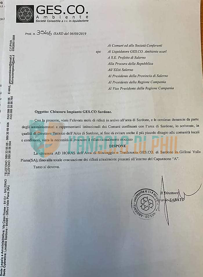 Il documento prot. 3546 ha come oggetto “Chiusura Impianto GES.CO Sardone”. Il direttore dell’impianto Gerardo Sabato, che noi abbiamo raggiunto al telefono, ha motivato in modo più originale il documento in questione. Se infatti il direttore metteva nero su bianco la chiusura dell’impianto “fino alla totale evacuazione dei rifiuti attualmente presenti all’interno del capannone A”, dopo averlo ascoltato ha subito