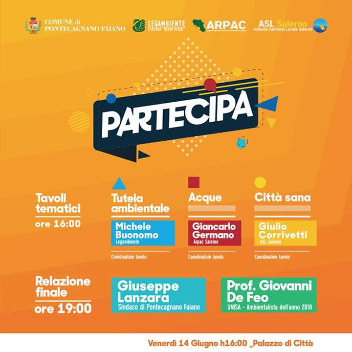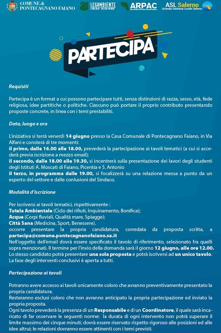 Il format così pensato nasce per coinvolgere i cittadini di Pontecagnano Faiano su temi molto sentiti. I tavoli sono stati organizzati ognuno con un coordinatore di riferimento: Michele Buonomo (Legambiente) per Tutela ambientale, Giancarlo Germano (Arpac Salerno) per Acque e Giulio Corrivetti (Asl Salerno) per Città sana.