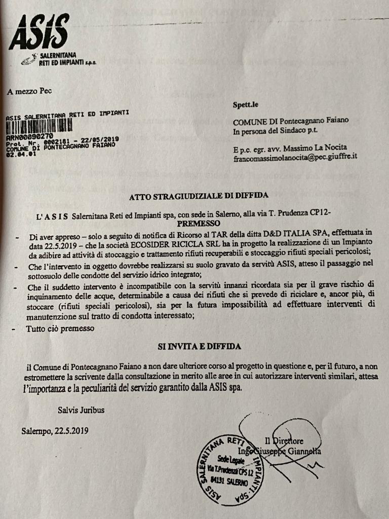 – In secondo luogo non si sarebbe tenuto conto della presenza di un pozzo artesiano e di una condotta idrica di competenza ASIS oggetto anche di formale diffida dalla società Asis spa al Comune di Pontecagnano Faiano Cartografia dell’area oggetto di progetto di Impianto in Via Irno con indicazione della condotta ASIS.