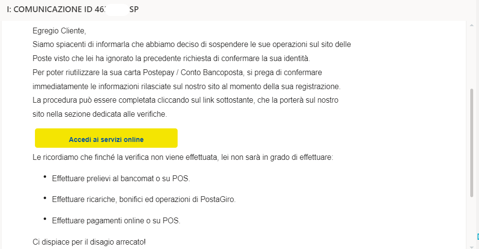 SMISHING – Si tratta del fenomeno dello Smishing, una frode con cui i criminali informatici, spacciandosi per mittenti noti alla vittima, inviano SMS o EMAIL contenenti LINK che reindirizzano su siti contraffatti, simili a quelli ufficiali, per carpire i dati personali ed operare a danno dei clienti. Purtroppo, tali messaggi sono molto credibili ed è facile essere tratti in inganno, in quanto potrebbero avere come mittente anche “PosteInfo” e “PostePay” e potresti visualizzarlo nella stessa lista dei messaggi effettivamente inviati da Poste Italiane o PostePay.