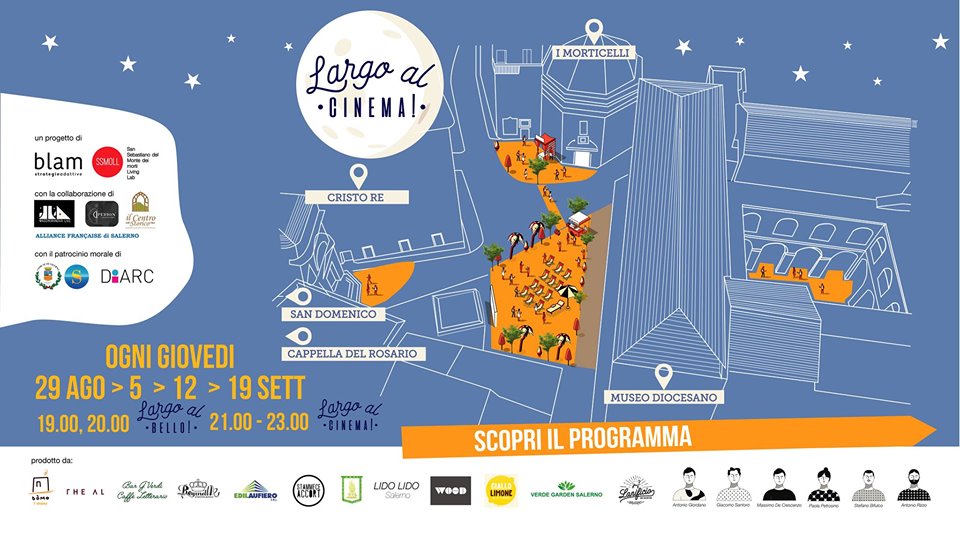 Alle 21:00 inizia “Largo al CINEMA!”; il cinema come forma principale di aggregazione che dal punto di vista culturale è quella che è preferita dagli italiani, in questo caso l’aggregazione opera in uno spazio inusuale che è quella di Largo Plebiscito, la porta a nord del centro storico che è stata completamente dimenticata negli anni fino a diventare luogo di parcheggio selvaggio delle auto, in prossimità del varco della zona a traffico limitato. La pedonalizzazione dello spazio attraverso un’azione di comunità, è nata con assemblee pubbliche, la scelta dei film avvenuta attraverso una votazione on-line e il coinvolgimento attivo dei salernitani.