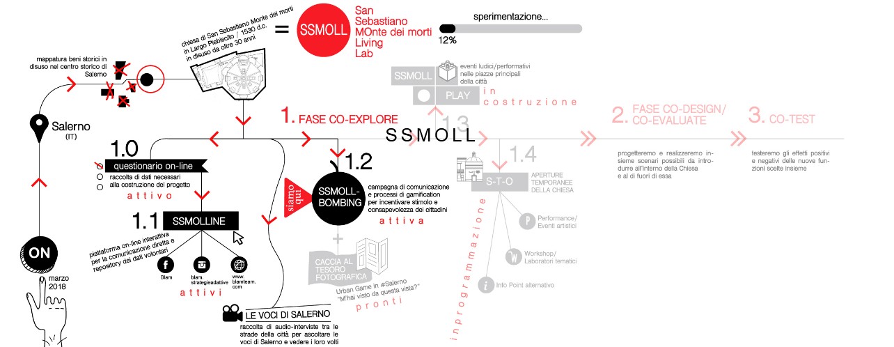 Il progetto, che vede coinvolto anche il Dipartimento di Architettura dell’Università Federico II di Napoli ed ha come responsabile scientifico la Prof.ssa Maria Cerreta, dopo 9 mesi ha portato all’apertura dello spazio. Ora rinnovata fino ad Agosto 2020, l’esperienza è iniziata immaginando che questo spazio potesse essere il cervello di una serie di operazione che mettessero in luce la parte alta del centro storico. Trasformato in un laboratorio urbano, il progetto prende il nome di SSMOLL acronimo di “San Sebastiano Monte dei morti Living Lab”, ma nasconde anche il richiamo allo spazio piccolo (in inglese “small”) che è la chiesa dei Morticelli.