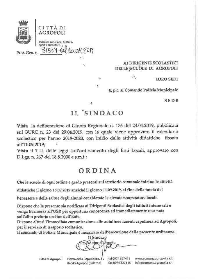 Con questa frase il sindaco di Agropoli, Adamo Coppola, annuncia ciò che ogni studente ha sempre sognato nella sua carriera scolastica: il posticipo dell’apertura della scuola dopo le vacanze estive.