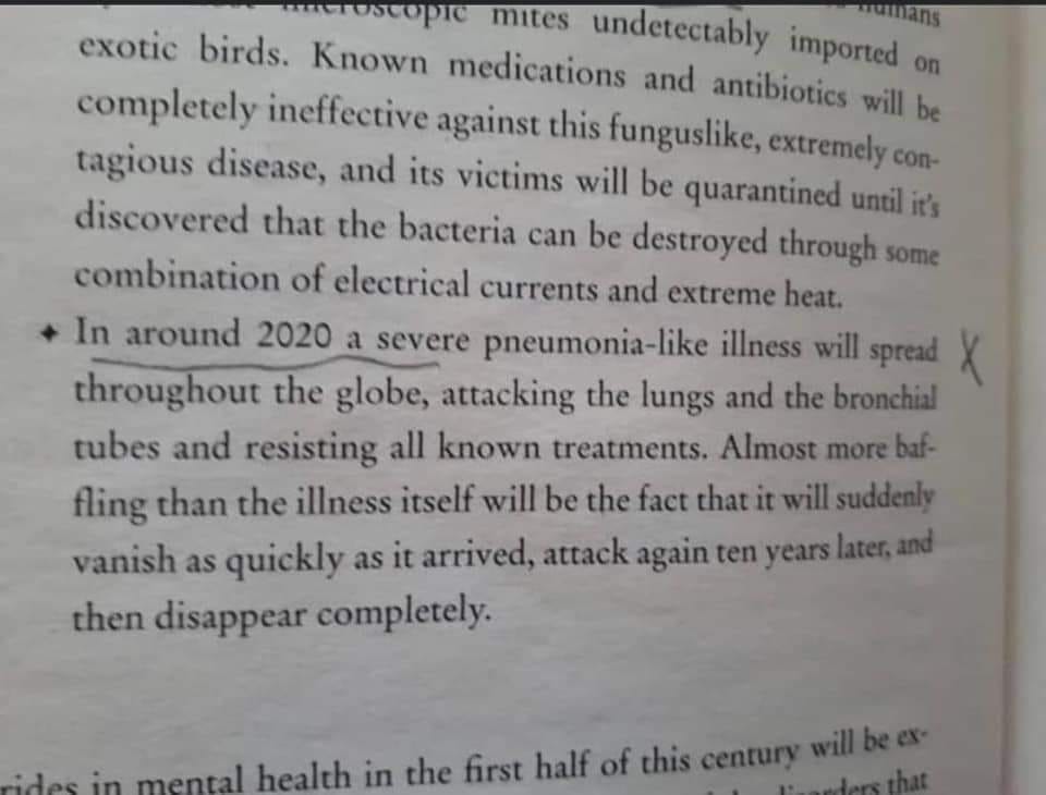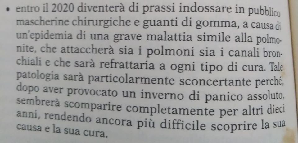 “Nel 2020 diventerà prassi indossare in pubblico mascherine chirurgiche e guanti di gomma, a causa di un’epidemia di una grave malattia simile alla polmonite, che attaccherà sia i polmoni sia i canali bronchiali e sarà refrattaria ad ogni tipo di cura. Tale patologia sarà particolarmente sconcertante, perchè dopo aver provocato un inverno di panico assoluto, sembrerà scomparire completamente per 10 anni, rendendo ancor più difficile scoprire la sua causa e la sua natura”